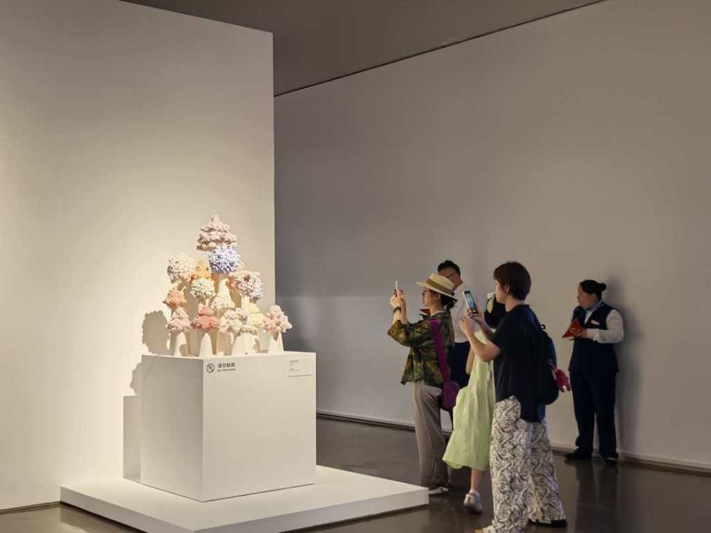 当代板块展出的实验性作品则将传统工艺融入了当代生活。比如苏献忠的《纸》,以极致的轻薄柔软,重塑白瓷的坚硬形态,从层层叠叠、薄如蝉翼的“纸”中,流淌出极致的反差感与诗意;《等花开》由一朵朵小花组成,花树错落、色彩斑斓,将传统捏塑工艺发挥到极致;张嘿瑞的《月球甜筒系列》则旋出冰淇淋形状的中秋满月,点缀激萌玉兔,该作成为红极一时的热搜爆款,吸引众多明星收藏。