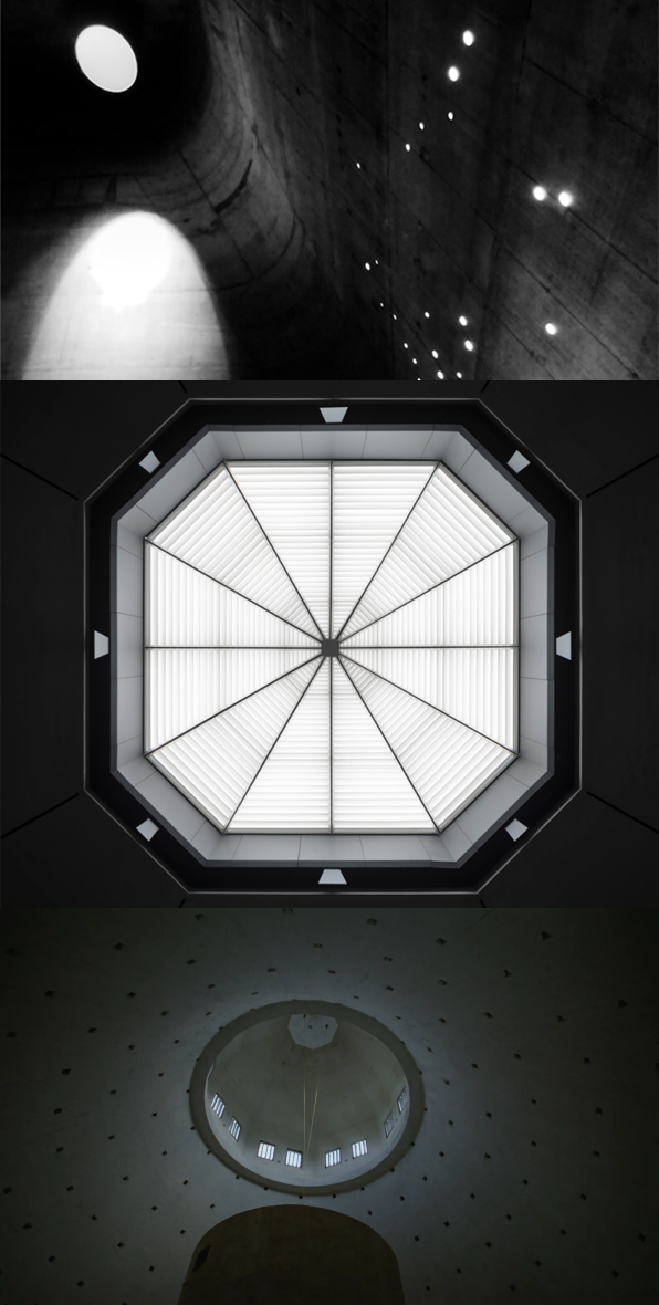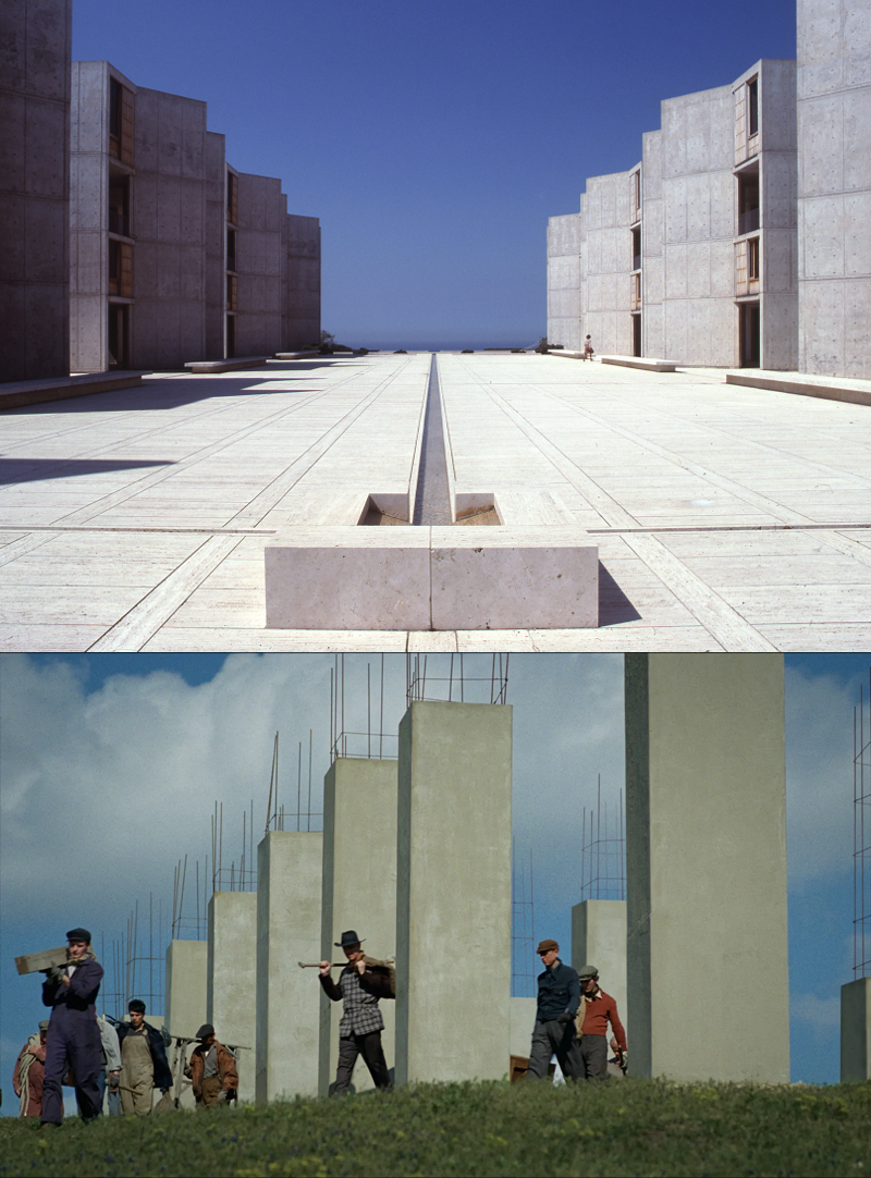 建筑师路易斯·康的沙克生物学研究所(上)与电影《粗野派》中的建筑(下)