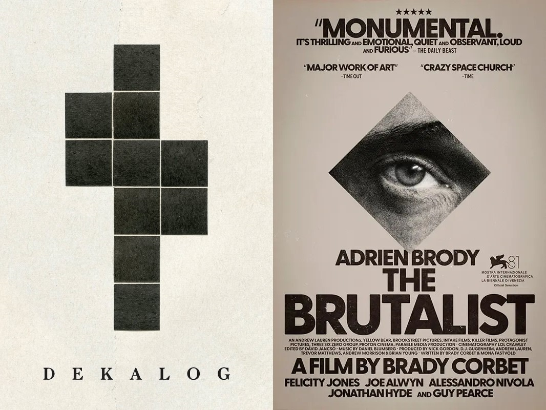 1989年波兰电视剧《十诫》以粗野派建筑为题材,左图:《十诫》海报,右图:《粗野派》海报