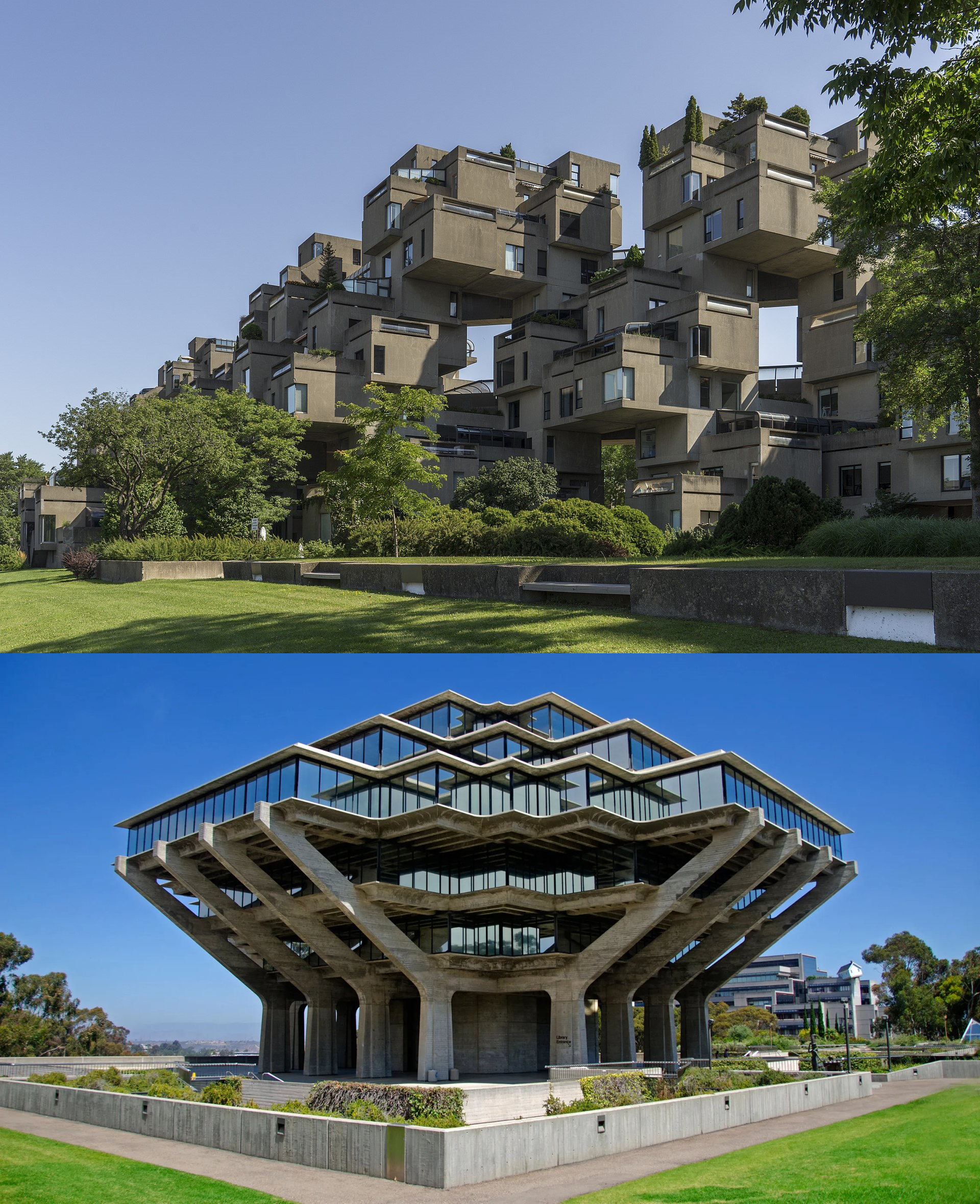 上:以色列建筑师摩西·萨夫迪的加拿大蒙特利尔栖息地67号 下:美国犹太建筑师威廉·佩雷拉的加州大学圣地亚哥分校图书馆
