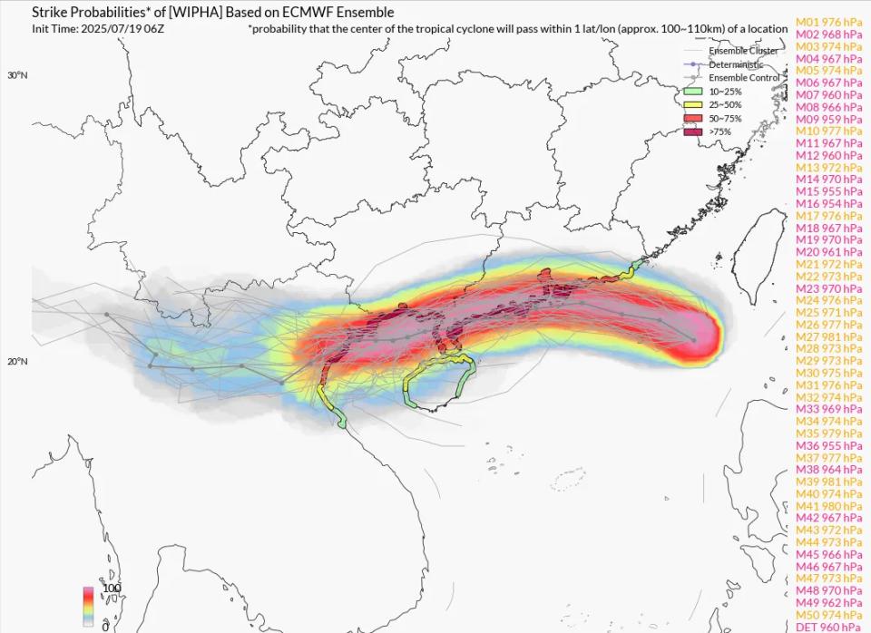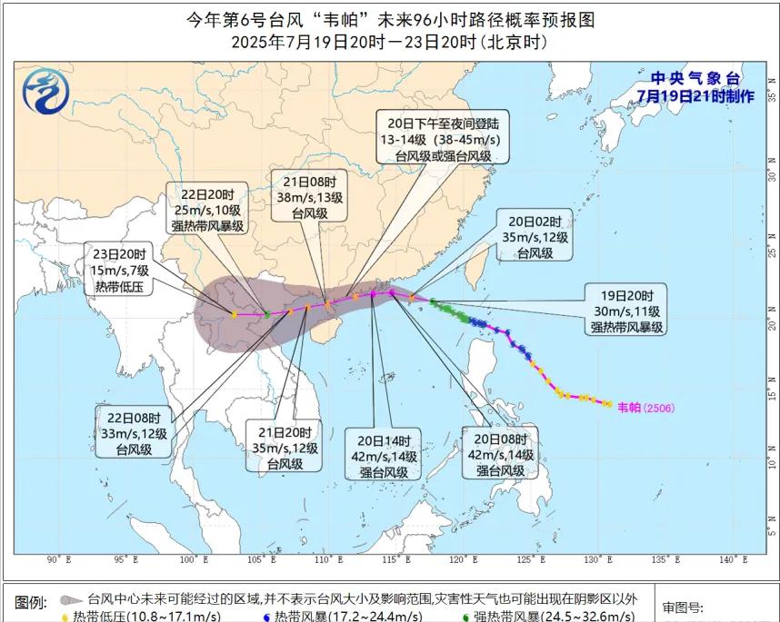 这样一来,韦帕的移动方向将和广东中西部海岸线完全平行。它最大可能是于 7 月 20 日上午在香港以南约 60 公里掠过,随后 7 月 20 日下午到晚上紧贴珠海、澳门、江门、阳江、茂名海岸线,并可能在上述地区多次登陆,最终在湛江登陆,穿过雷州半岛后再下海进入北部湾,掠过广西涠洲岛附近后,再到越南登陆。