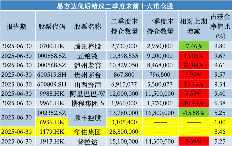 具体来看,易方达优质精选期末前十大重仓股依次为:腾讯控股、五粮液、泸州老窖、贵州茅台、山西汾酒、阿里巴巴、携程集团(09961.HK)、顺丰控股AH股(002352.SZ、06936.HK)、华住集团(01179.HK)、普拉达(01913.HK)。