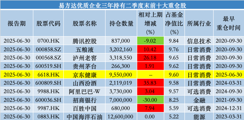 京东健康新进易方达优质企业三年持有的持仓前十。在2024年下半年,该基金便首次建仓京东健康,彼时持股数量为33万股;截至2025年二季度末,易方达优质企业三年持有对京东健康的持仓数量已达955万股。