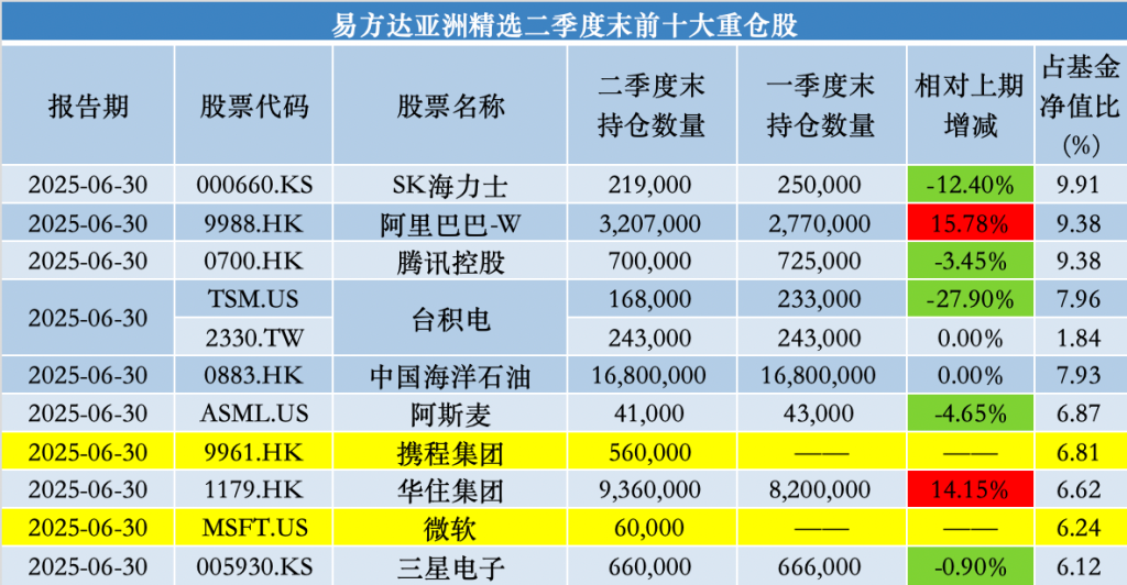 另一方面,易方达亚洲精选还减持了台积电、阿斯迈等,富途控股、普拉达则退出持仓前十。