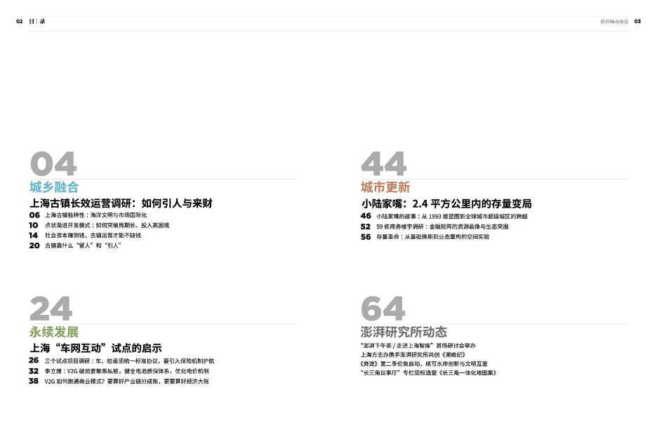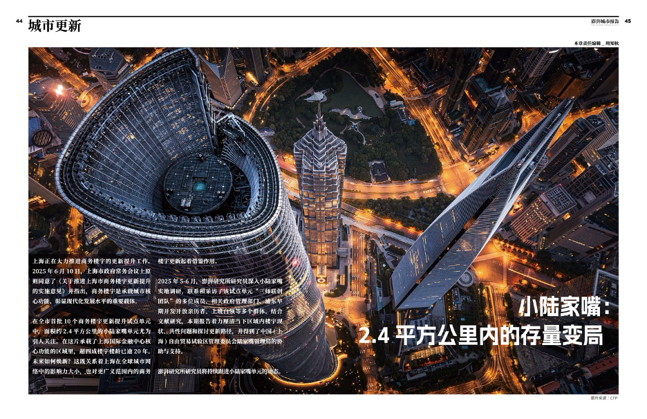 《澎湃城市报告》总第25期《上海商务楼宇更新调研①小陆家嘴》已于6月25日发布,本报告包含《上海古镇长效运营调研:如何引人与来财》、《上海“车网互动”试点的启示》和《小陆家嘴:2.4平方公里内的存量变局》3份子报告。