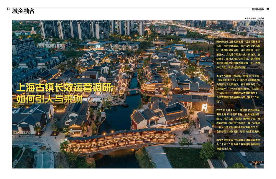 国家级历史文化名镇名村指的是建制镇,包含历史文化风貌区、新镇区和周边村。可以说是镇上历史最悠久、文化遗存最集中成片的地区,也是城乡、镇村之间的空间节点,是上海城市更新议题中内容较为复杂的一块,涉及历史文化、社会民生等议题。2025年4月至6月,澎湃研究所研究员调研上海13个名镇名村,在实地走访基础上,结合文献(政策)梳理和学者、政府管理部门和运营主体采访,探讨古镇这一有关历史文化和民生的城乡融合节点,在新形势下如何更新、运营才能长效发展。