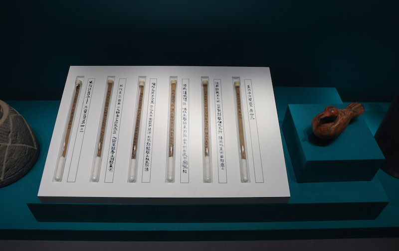 王杖诏书令册简(左)与彩绘漆木鸠(右),武威市博物馆藏