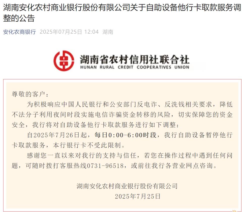 7 月 25 日,湖南安化农商银行发布公告,为积极响应中国人民银行和公安部门反电诈、反洗钱相关要求,降低不法分子利用夜间时段实施电信诈骗资金转移的风险,切实保障客户资金安全,该行将对自助设备他行卡取款服务进行调整。自 2025 年 7 月 26 日起,每日 0:00-6:00 时段,该行自助设备暂停他行卡取款服务,该行银行卡不受此限制。