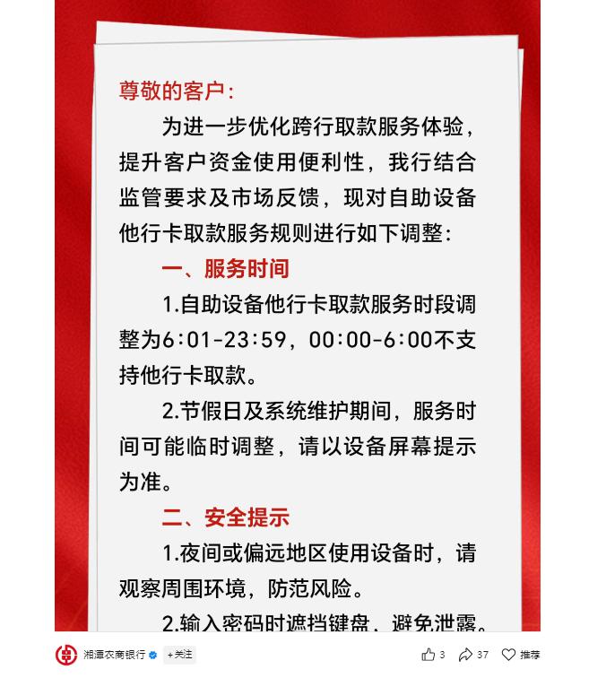 7 月 23 日下午,湘潭农商行也发布自助设备他行卡取款服务调整的公告,同样指出 "0:00-6:00,不支持他行卡取款。"