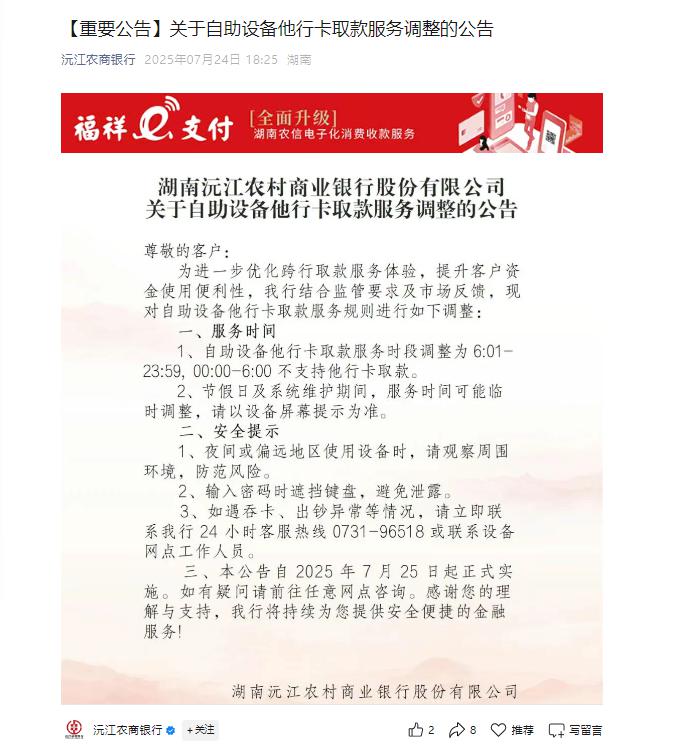 7 月 24 日晚间,沅江农商行表示,为进一步优化跨行取款服务体验,提升客户资金使用便利性,该行结合监管要求及市场反馈,现对自助设备他行卡取款服务规则进行调整。其具体调整为,自助设备他行卡取款服务时段调整为 6:01 至 23.59,0:00 至 6:00 不支持他行卡取款,并于 7 月 25 日起正式实施。