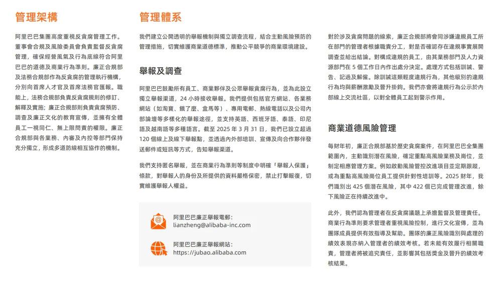 在笔者的认知中,阿里巴巴近几年的 ESG 工作可以说领先同行,但这次却 " 踩了雷 "。据阿里巴巴 2025 年 ESG 报告披露,集团高度重视反贪腐工作,董事会合规及风险委员会负责监督反贪腐。在细项上,设立了独立举报渠道,且每财年都会为高风险岗位员工提供培训。