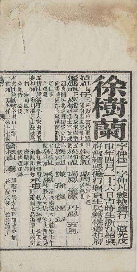 《徐树兰乡试朱卷》载,徐树兰之妹“适同邑陈、诰授奉直大夫嘉庆戊辰恩科举人五品衔广东补用知县历任广东大洲电白场盐大使讳鸿逵公孙、议叙六品衔盐大使名堉庚公次子、议叙从九品名华林”。据陈庆均《诰授儒林郎诰封奉政大夫晋封中议大夫芳畦公节略》,陈华林,即陈英(1838—1898),一名锡蕃、华林,字芳畦。其实为陈庆均之叔父,由于徐树兰妹妹生五女,不生男。以兄惺第三子庆均为后(陈庆均著,邓政阳整理《陈庆均日记》第439页)。故陈庆均称徐树兰为舅舅。