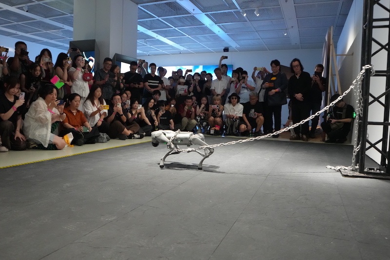藤堂高行在上海民生现代美术馆“提视造境”中呈现的作品《拴狗的动能》展示了想要从束缚中解脱的机器人,他提到,虽然他创作过程中出现不同类型的作品,但他的核心关切是相同的:如何在与机器的交互中照见人自身?。机器人正在融入人的社会中,它们对于人类心理与认知所产生的影响是我们需要预先思考的问题。