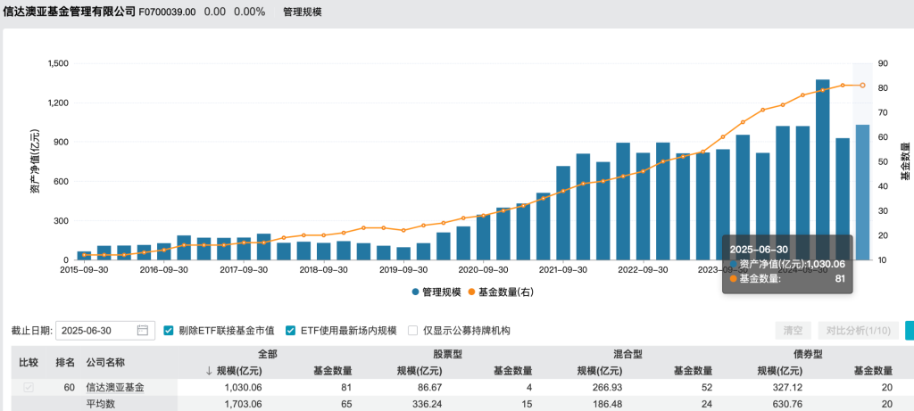 Wind数据显示,信达澳亚基金曾于2024年末触及规模峰值,达1374.51亿元;截至2025年6月末,公司在管规模已较巅峰时缩水超300亿元,滑落至1030.06亿元,在业内排名60/194。从基金类型来看,固收类基金(包括货币市场型基金、债券型基金)的规模为676.08亿元,占比为65.64%;而权益类基金(包括股票型基金、混合型基金)的规模则为353.60亿元,占比为34.33%。