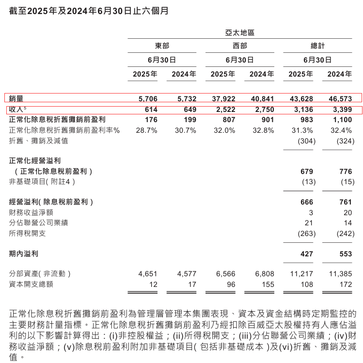 亚太地区西部于2025年上半年,销量及收入分别减少6.9%及7.1%,而每百升收入减少0.2%。正常化除息税折旧摊销前盈利减少8.8%。
