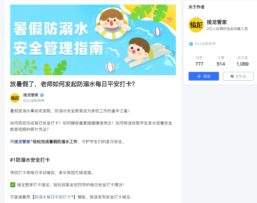 “用接龙管家轻松完成暑假防溺水工作,守护学生们的夏日安全。”打卡这么多年,我还是难以理解接龙管家的这句宣传语,接龙打卡都能守护学生的夏日安全,那学习游泳还有啥用?