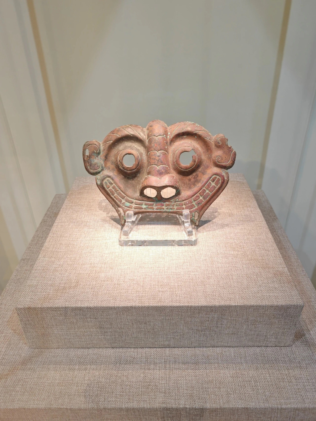展览第一部分“交往·文明的初遇与碰撞”呈现了江南融入华夏文明的早期历程。一件西周青铜兽面面具尤为引人注目——头顶粗壮的菌状双角,双目圆睁,嘴角弯曲獠牙,彰显着北方青铜文明的庄严力量。而来自绍兴博物馆的春秋“配儿”青铜勾鑃,则展示了江南本土乐器的独特形制。两条文化纽带在此交织:泰伯、仲雍奔吴开启中原文化南传;孔子唯一的南方弟子言偃(常熟人)学成北归,架起南北文化桥梁。
