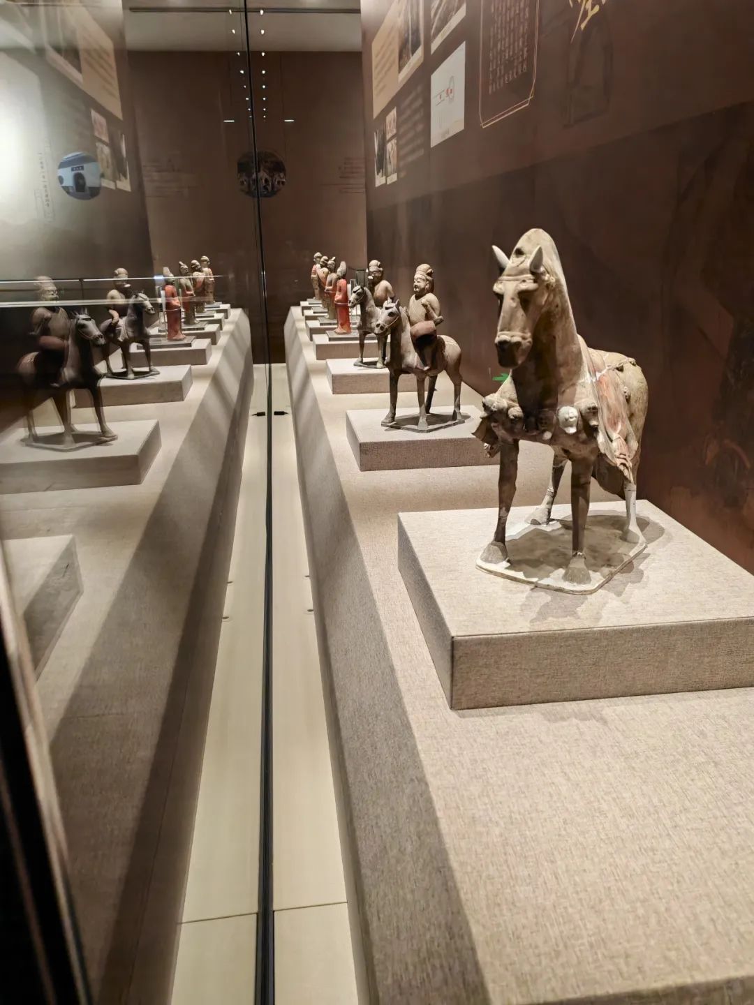步入展厅,首批出土的五尊秦兵马俑之一——“001号先锋战士”秦短褐武士俑首先映入眼帘。这件来自西安市临潼区博物馆的国宝,距今已有2200多年历史。武士俑发髻偏于头顶一侧,面部表情坚毅,身穿典型的汉服交领右衽衣,腰系革带,下着短裤,左手自然下垂,右手原持兵器。其威严肃穆的姿态,生动展现了秦军将士的英武形象。