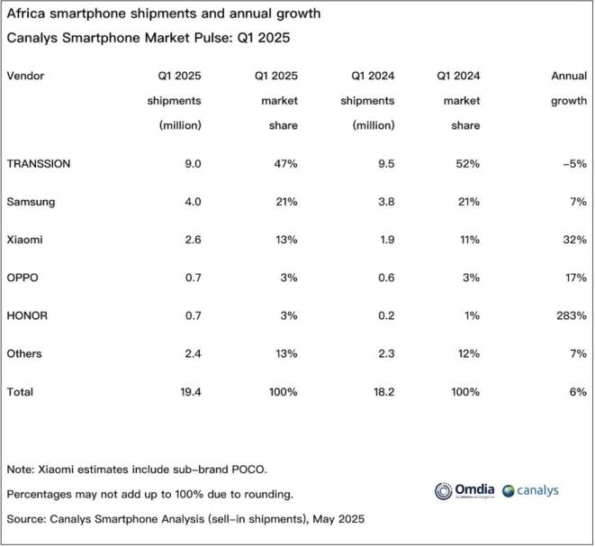 Canalys统计2025年一季度非洲市场手机厂商出货量以及市场占有率情况