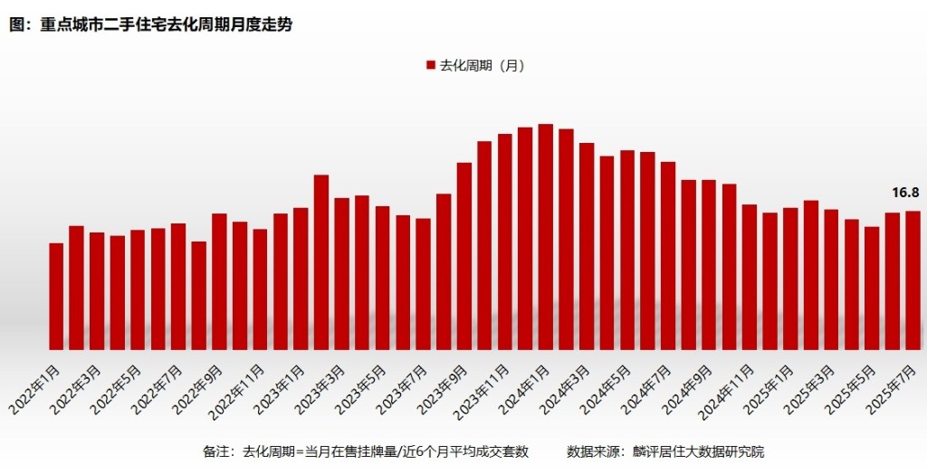 从去化周期来看,2025年7月重点城市的二手房去化周期为16.8个月,环比上升2.7%,同比下降17.2%。总体来看,今年二手房房屋的去化压力较去年下降,房屋流动性压力缓解,但6-7月受到在售挂牌量上升的带动,去化周期连续2月提升。