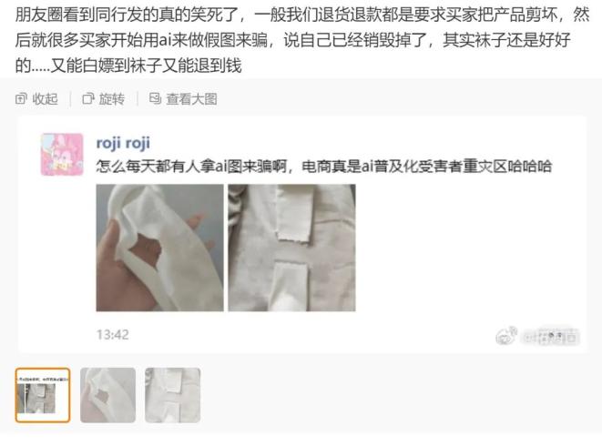 我们从电商卖家口中了解到,其实这种骗术由来已久。大概在十年前,就有买家通过 PS 等工具在正常商品的照片上 P 上瑕疵。但以普通用户的 P 图水平,如果卖家放大图片仔细去看,大部分时候还是能是看出来的。但现在 AI 做的图,鉴别起来就没有那么容易了。