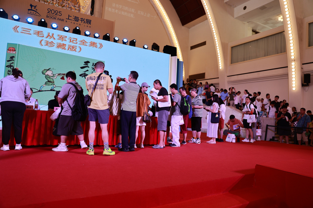 每年三毛漫画长长的签售队伍都是上海书展一景,今年读者从中央舞台右侧排队,队伍沿着台阶一直往上,直到书展序厅。90岁的三毛依然是这个时代的“国潮顶流”。