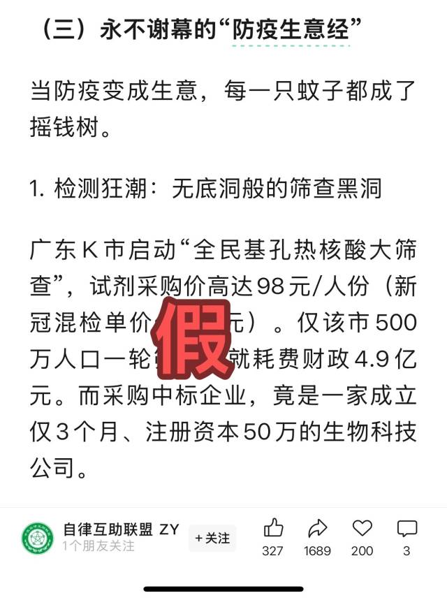 近日,一张朋友圈截图在网络流传,截图中称:广东K市启动全民基孔热核酸大筛查,试剂采购价高达98元/人份。仅该市500万人口一轮筛查,就耗费财政4.9亿元。而采购中标企业,竟是一家成立仅3个月、注册资本50万元的生物科技公司。截图中的相关内容也被一些自媒体引用到稿件中。