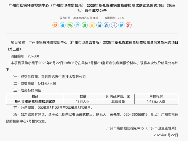广州疾控发布的基孔肯雅病毒核酸检测试剂采购项目成交公告
