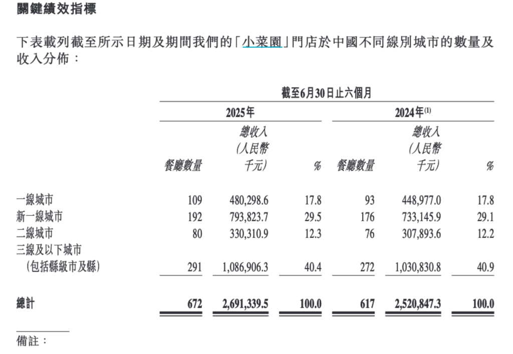 门店数量方面,小菜园从2024年6月30日的617家增至2025年6月30日的672家,其中,三线及以下城市门店291家,占比超四成,贡献了超四成的营收;新一线城市门店176家,占比近三成,营收占比29.5%。