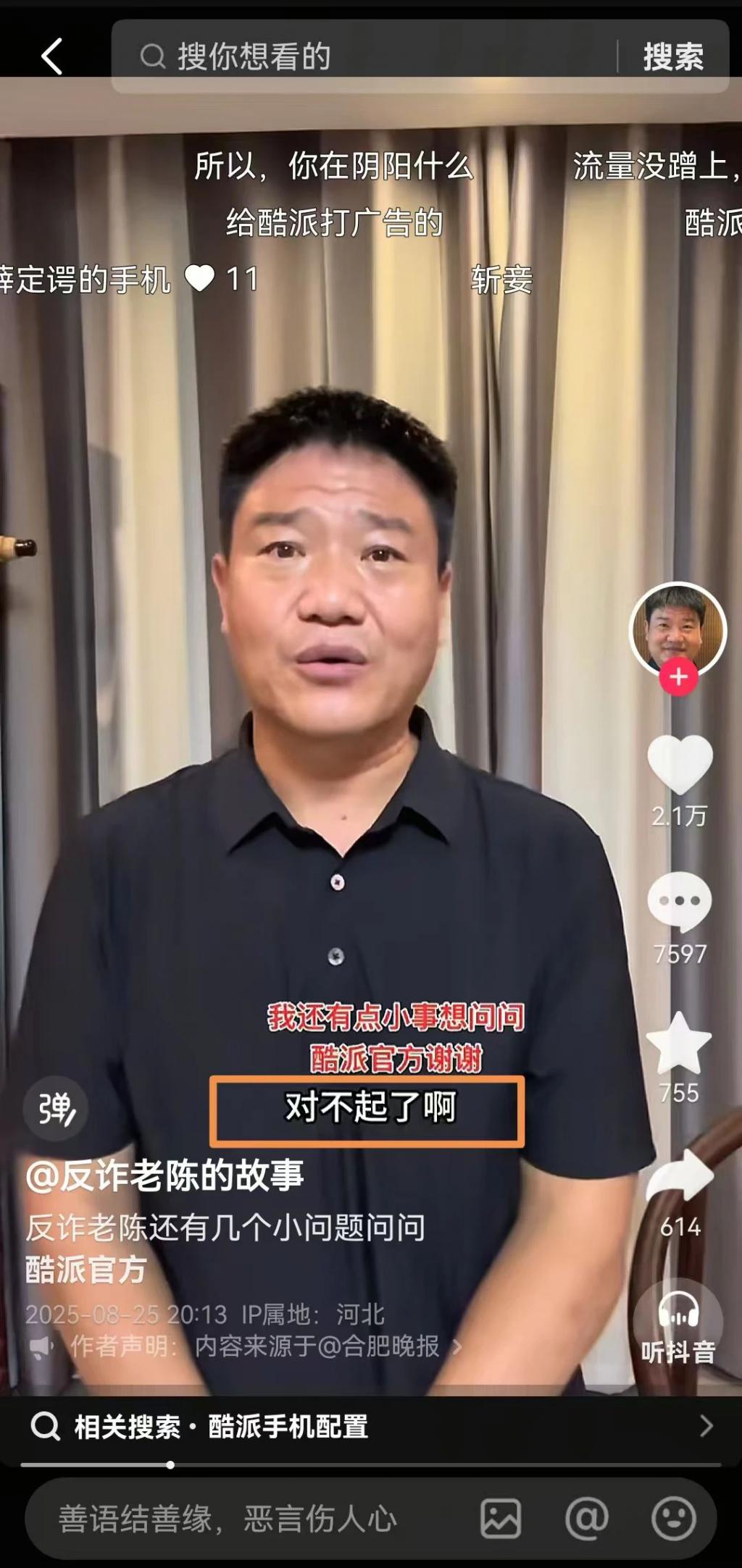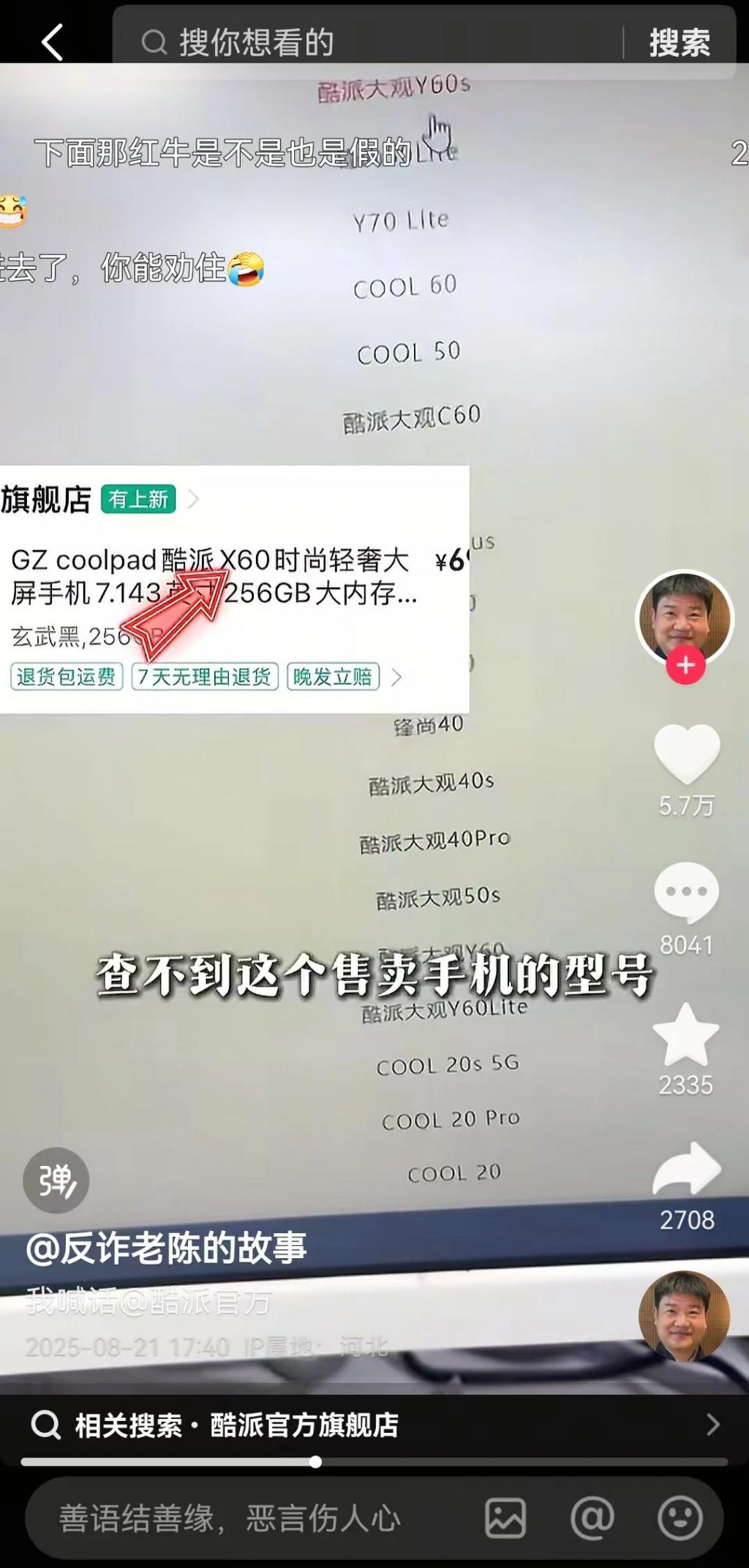 这一场闹剧,还得从反诈老陈 8 月 21 日发布的一则视频说起。视频中,反诈老陈喊话酷派手机官方,称有人在网上卖你们的产品,你们到底有没有这款产品?如果没有,跟老百姓说一声,别让别人冒充官方来坑老百姓。