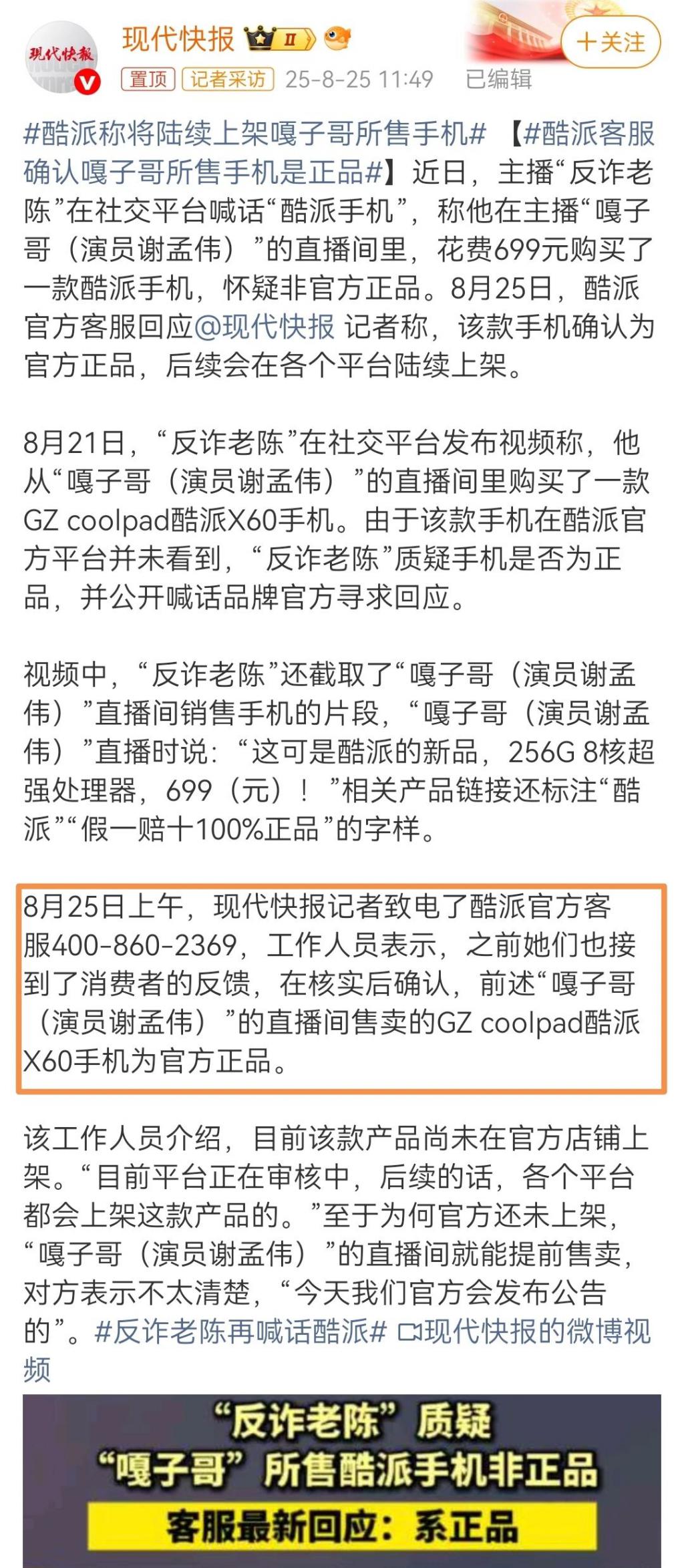 8 月 25 日,反诈老陈终于等来了酷派官方的回应。酷派官方客服承认嘎子哥直播间售卖的酷派 X60 手机为官方正品,并解释平台正在审核中,后续各个平台会上架这款产品。