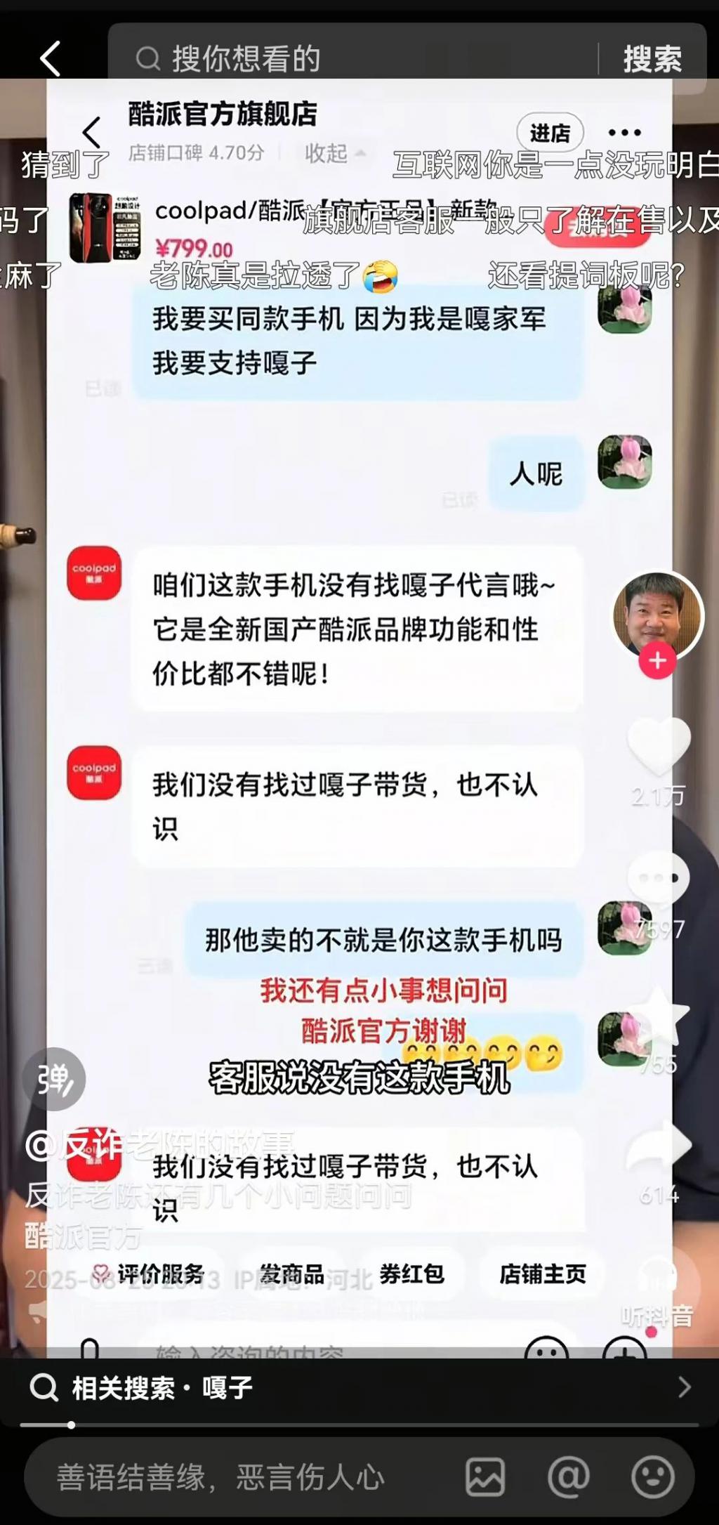 对于酷派官方客服的回应,反诈老陈提出质疑,称此前有网友去问客服,但客服表示没有找过嘎子哥代言、带货,也不认识。