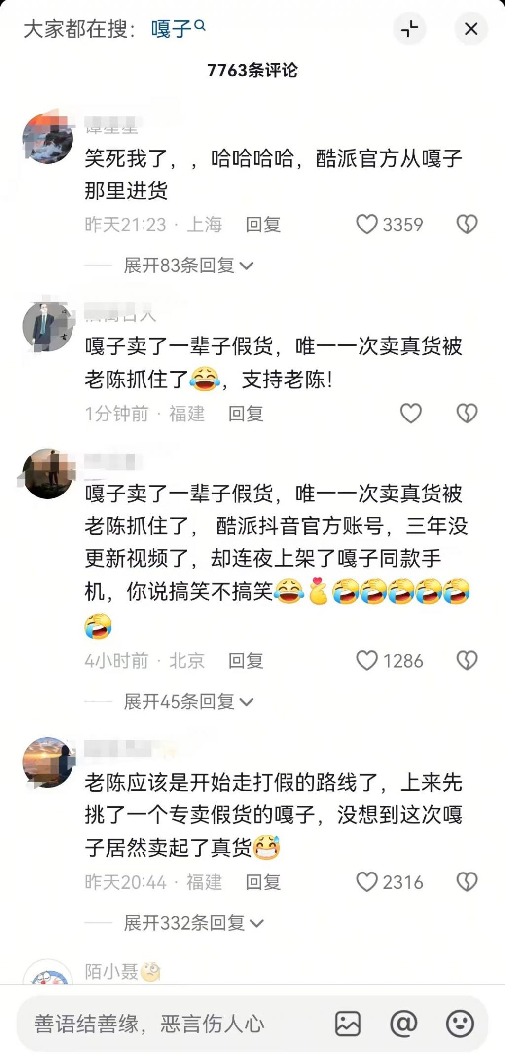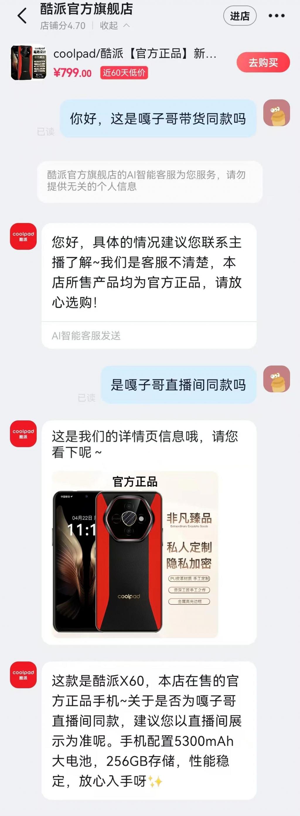 为此,反诈老陈质疑嘎子哥直播间所售卖的手机不是正品,希望酷派手机官方能给出正面回应。
