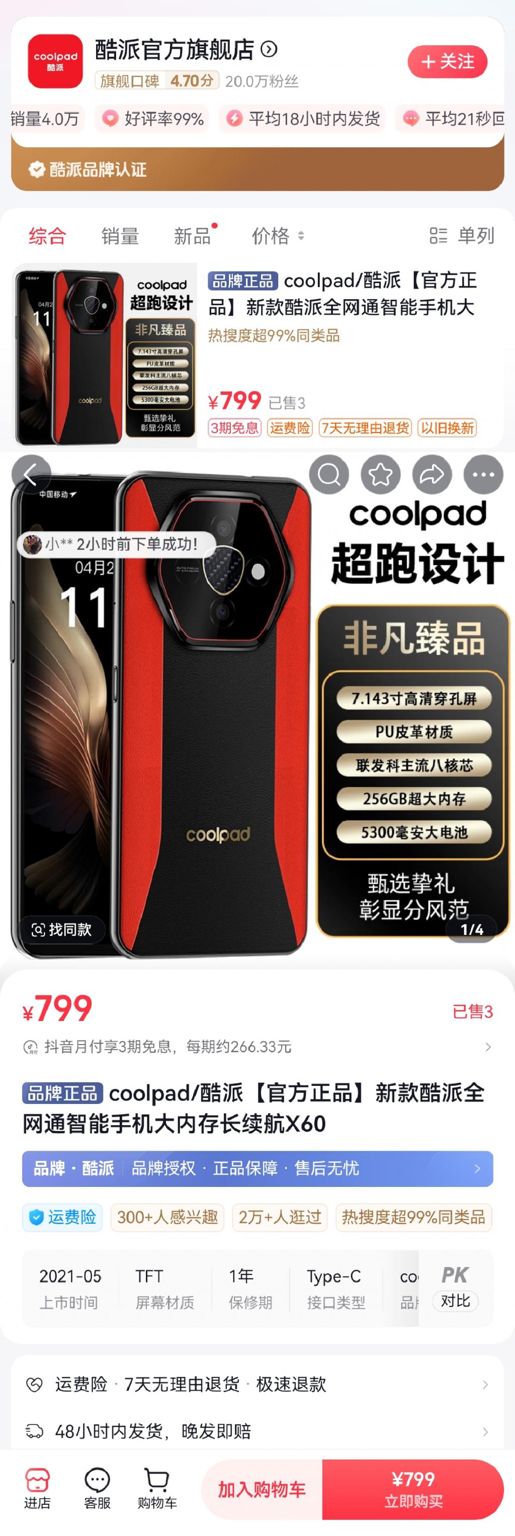 8 月 26 日,赵云合搜索发现,抖音酷派官方旗舰店已经上架酷派 X60 手机,售价 799 元,比嘎子哥直播间的价格高一百。