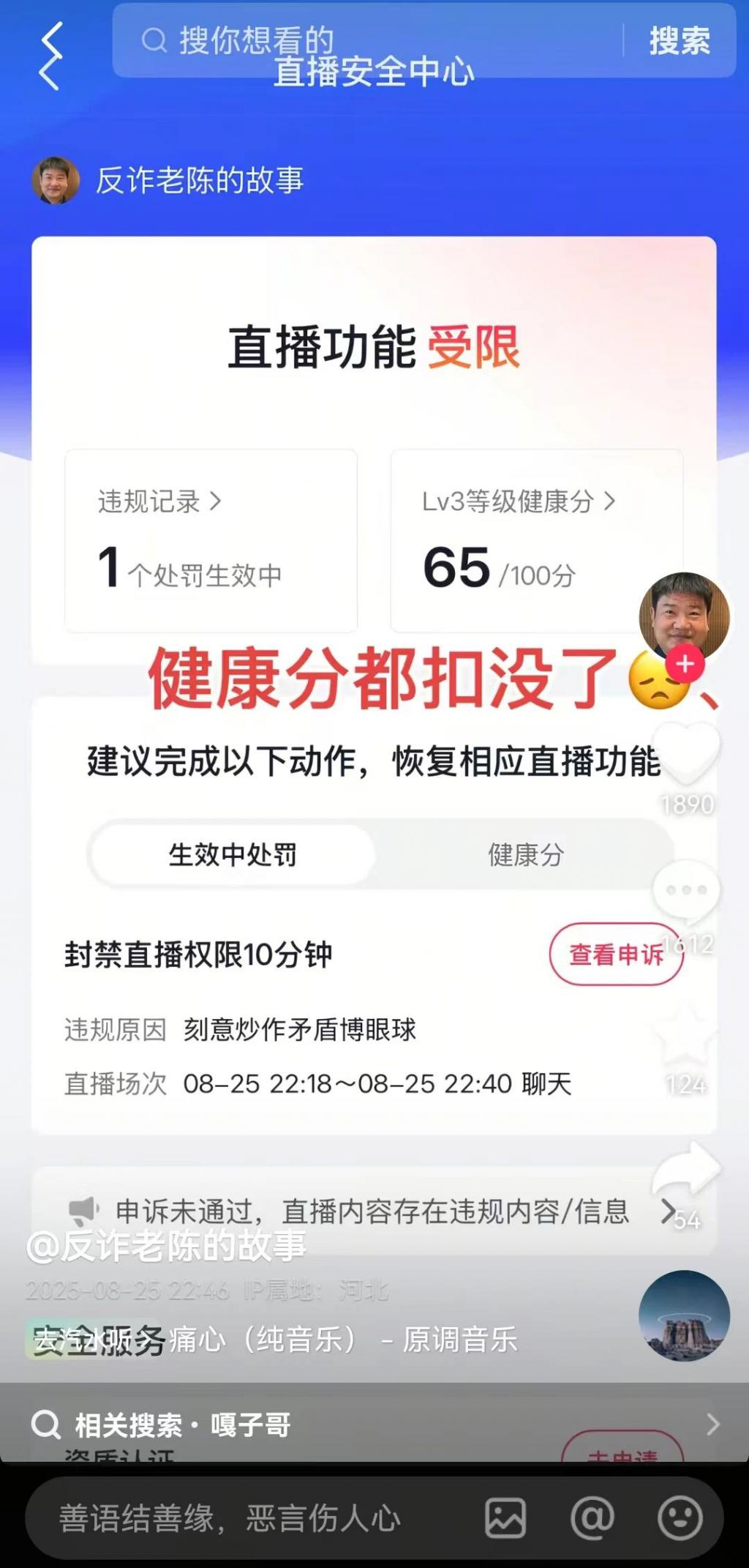 此外,反诈老陈还发布了一张截图,文案为 " 健康分都扣没了 "。照片内容显示,在 8 月 25 日的直播中,反诈老陈的直播间因刻意炒作矛盾博眼球,被封禁直播权限 10 分钟。