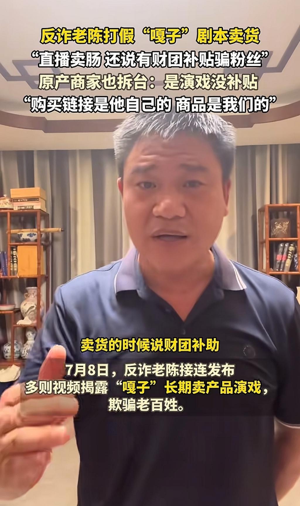没想到,今年 7 月,嘎子哥又被打假了,打假人正是反诈老陈。反诈老陈发布多个视频打假嘎子哥剧本卖货,欺骗消费者。