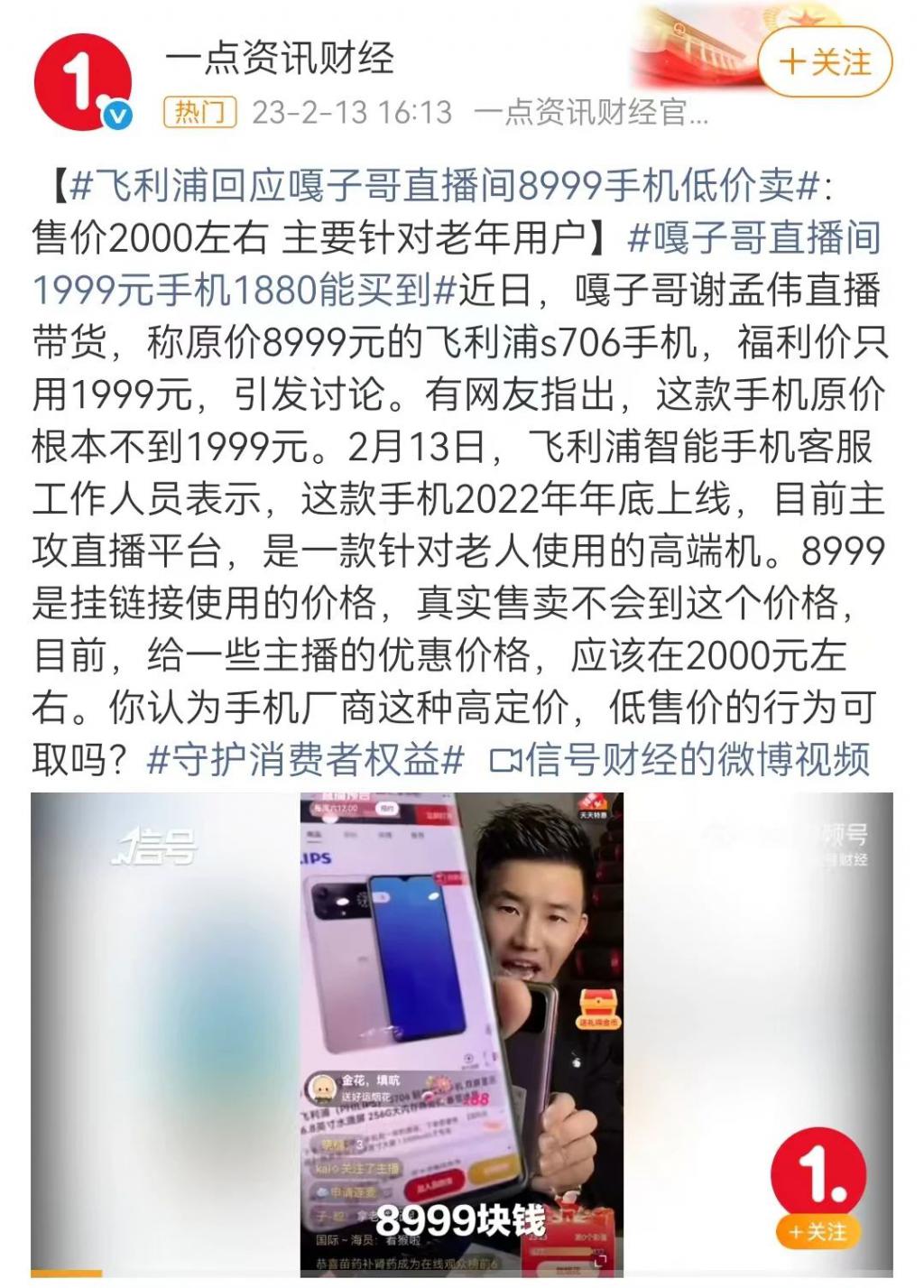 2023 年,嘎子哥又因为一款手机翻车。其在直播间宣称该手机原价 8999 元,并称因市场总监误标价格,故以 1999 元的亏本价售卖。但后续有网友指出,同款手机在其他平台仅售 1880 元,质疑嘎子哥虚假宣传。