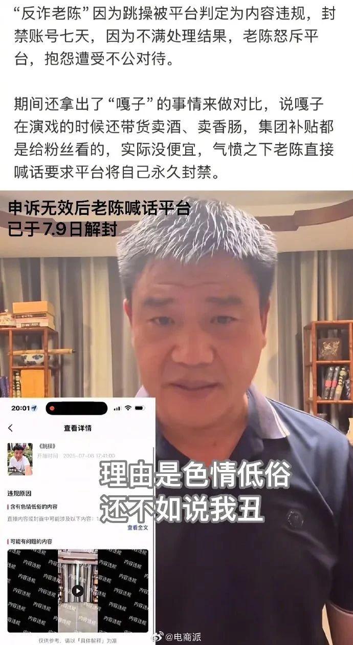 同时,反诈老陈还透露,发布打假视频当晚,他的账号被平台以色情低俗为由封禁 7 天。对此,反诈老陈怒斥平台双标,演戏带货的不封,自己跳个操就被说低俗。