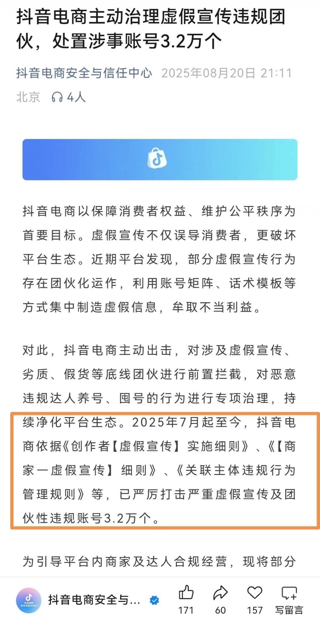 值得庆祝的是,2025 年 7 月起至今,抖音电商依据《创作者【虚假宣传】实施细则》、《【商家—虚假宣传】细则》、《关联主体违规行为管理规则》等,已严厉打击严重虚假宣传及团伙性违规账号 3.2 万个。