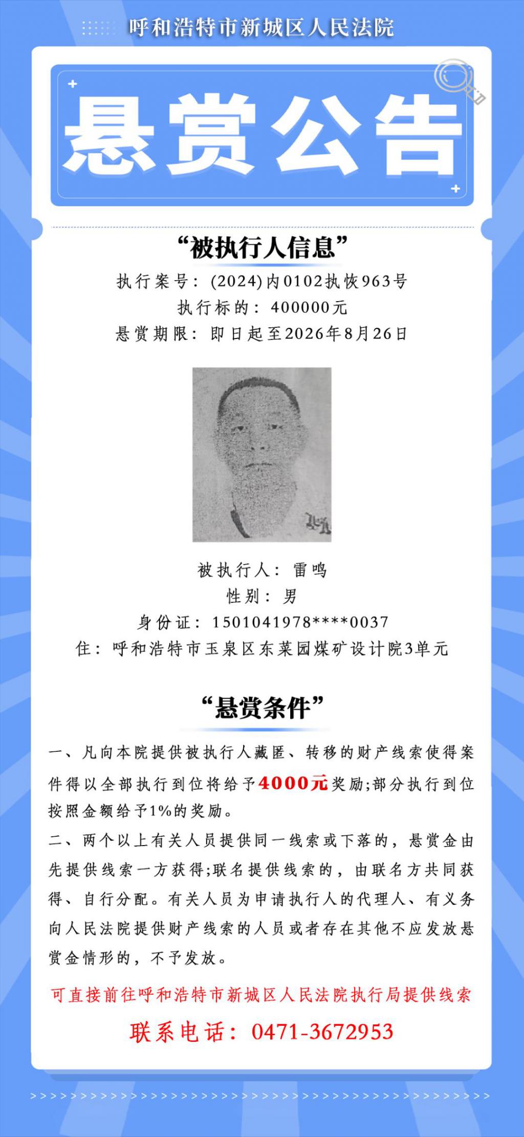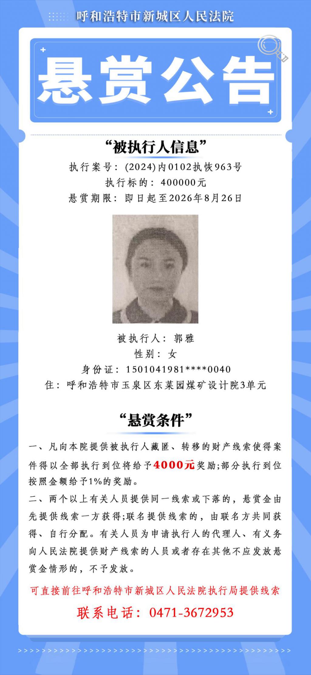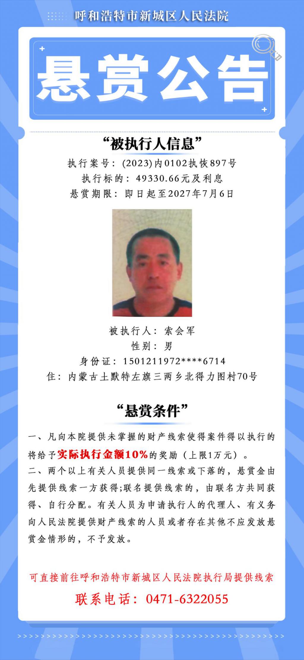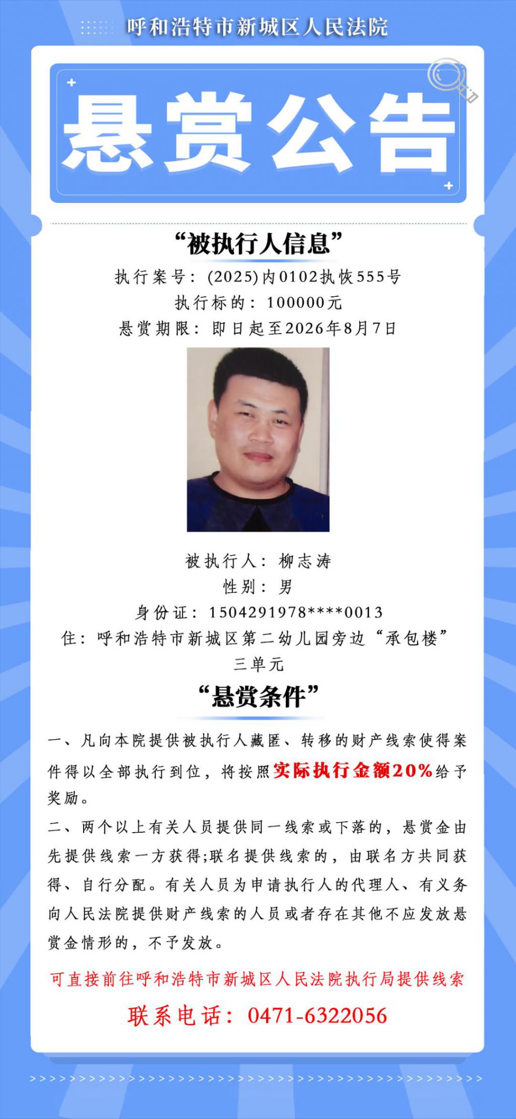 首页 > 综合 内蒙古一被执行人执行标的超1.1亿元,赏金可达100万元,呼和浩特一法院发布悬赏公告 8 月 26 日,呼和浩特市新城区人民法院发布《悬赏公告》,其中一名被执行人执行标的超 1.1 亿元。悬赏条件列明,凡向该法院提供被执行人藏匿、转移的财产线索使得案件得以全部执行到位将给予 1000000 元奖励 ; 部分执行到位按照金额给予 10% ( 最低 5000 元,最高 100 万元 ) 的奖励。
