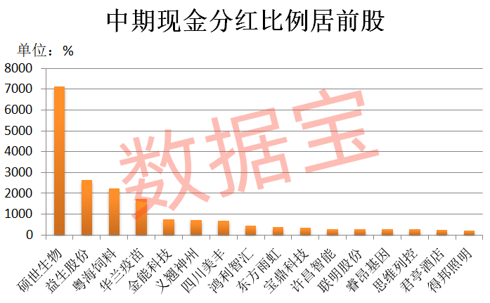 以现金分红比例观察,共有240家公司将拿出本期净利润的一半以上进行分红。现金分红比例排在前五位的是硕世生物、益生股份、粤海饲料、华兰疫苗、金能科技,这5家公司今年上半年净利润均不到3000万元,但拟派现的金额均达到1亿元以上。