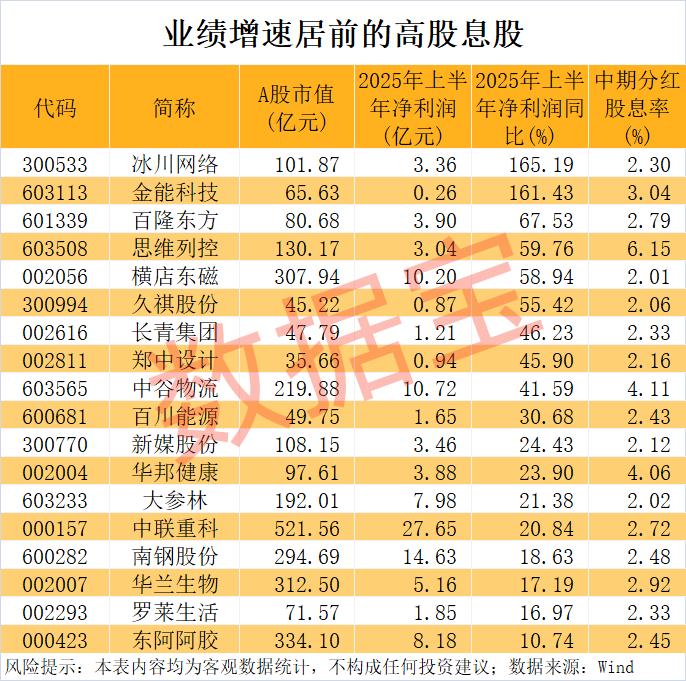 从业绩数据来看,上述股息率达到2%以上的股票中,6股今年上半年净利润增速超50%(含扭亏为盈),分别是冰川网络、金能科技、百隆东方、思维列控、横店东磁、久祺股份。