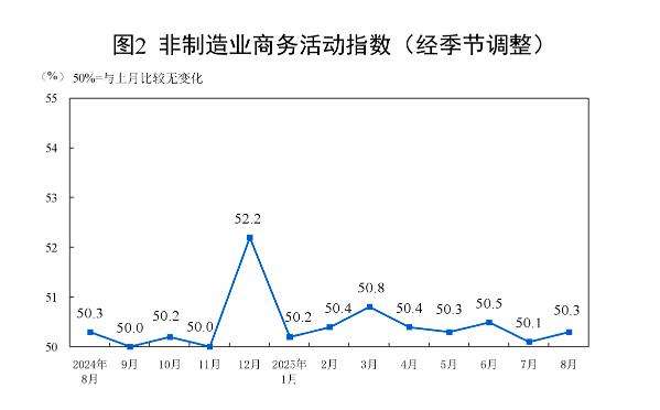 8 月份,非制造业商务活动指数为 50.3%,比上月上升 0.2 个百分点,非制造业继续保持扩张。