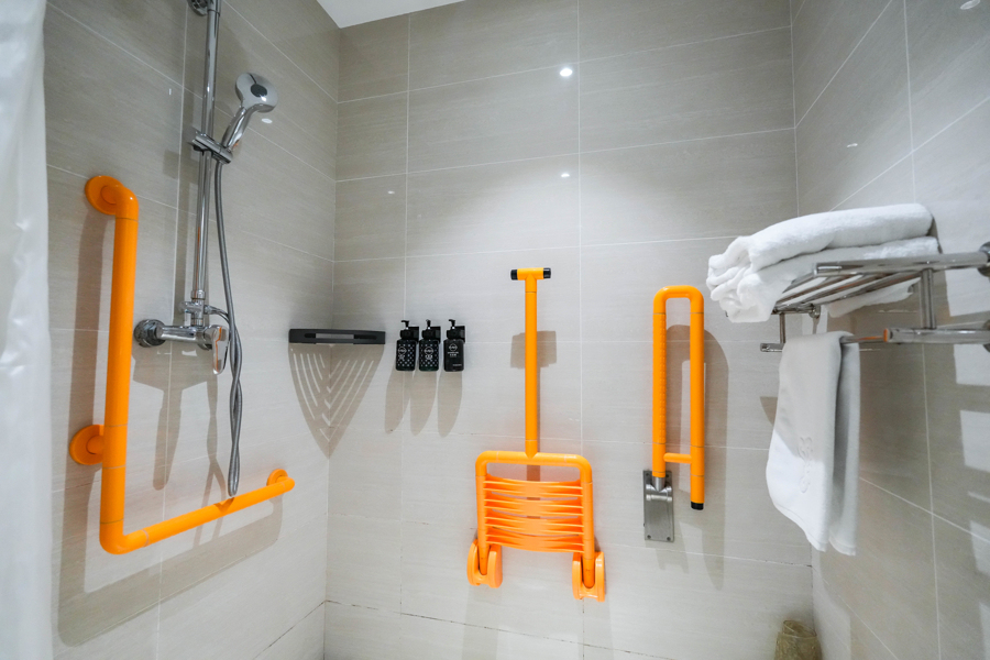 空间布局方面,酒店调整了房门和卫生间门框的宽度,从通常的0.8米加宽到了0.9米,方便轮椅自如进出,同时将所有电源开关、灯光控制和电源插座的位置都降低到坐姿可轻松触及的高度。卫生设施方面,酒店采用了无高差设计(零门槛),淋浴区域安装了折叠式沐浴凳、安全扶手、可调节高度的手持花洒和防滑地砖,为住客提供更安全、便捷的辅助功能。除此之外,酒店还在客房的床两侧和卫生间均安装了紧急呼叫按钮,直接联通服务中心,提高安全性能。据介绍,不仅仅是上海景苑水庄酒店,虹珠花园酒店参照同等标准改造的8间无障碍客房目前也已基本竣工。