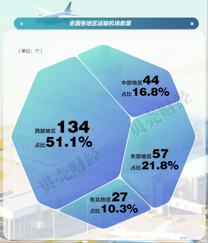 数据显示,已建成的 262 个运输机场中,西部地区达到 134 个,占比超过 50%,中部地区接近 17%,合计接近 70%。