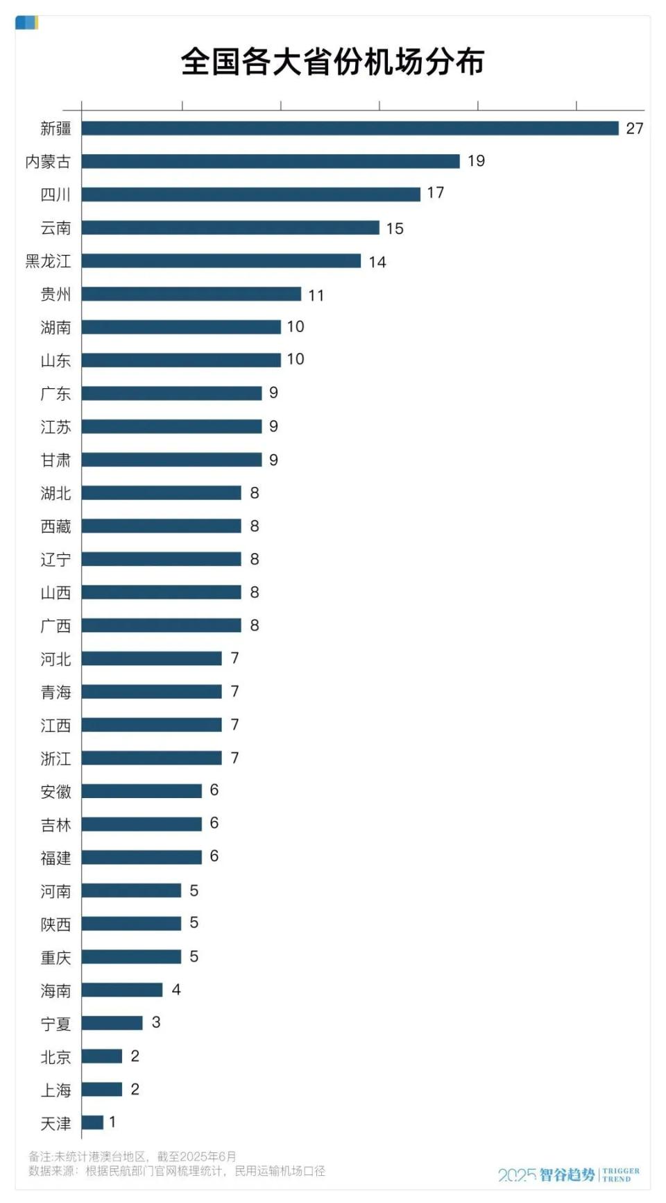 这里面非常重要的一个原因就是,像新疆、内蒙古、四川、贵州等省份,不仅面积相对较大,且地形复杂。这种情况下,机场反而是最具性价比的交通方式。