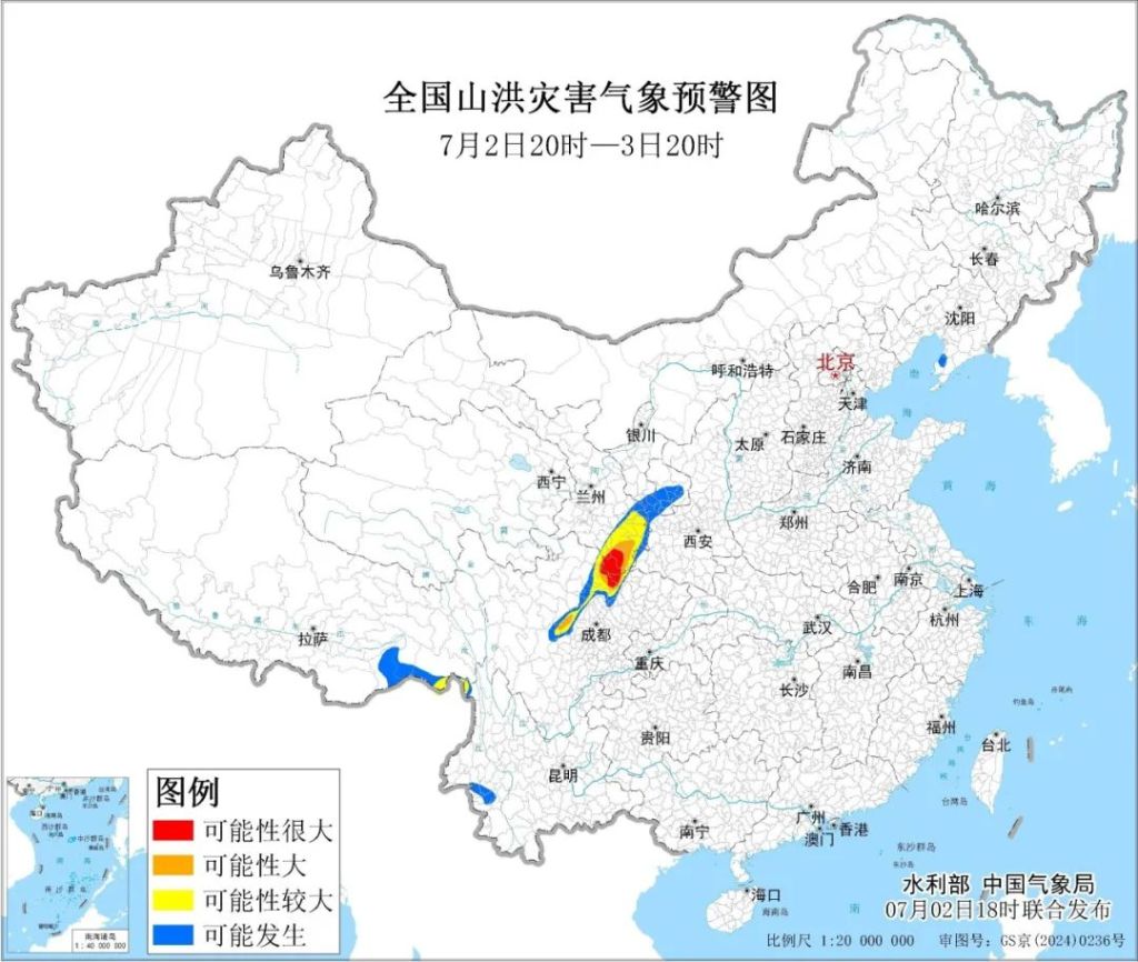 水利部和中国气象局7月2日18时联合发布红色山洪灾害气象预警:预计,7月2日20时至7月3日20时,...