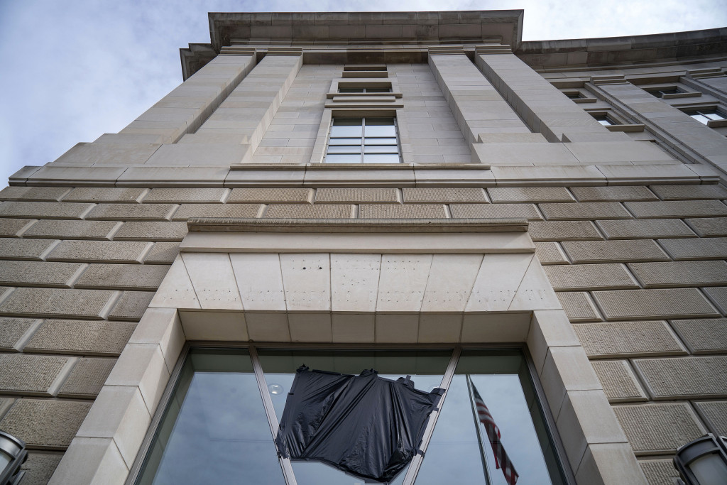 当地时间2025年2月18日,华盛顿特区,美国国际开发署(USAID)总部大楼外部在标牌被撤除后留下...