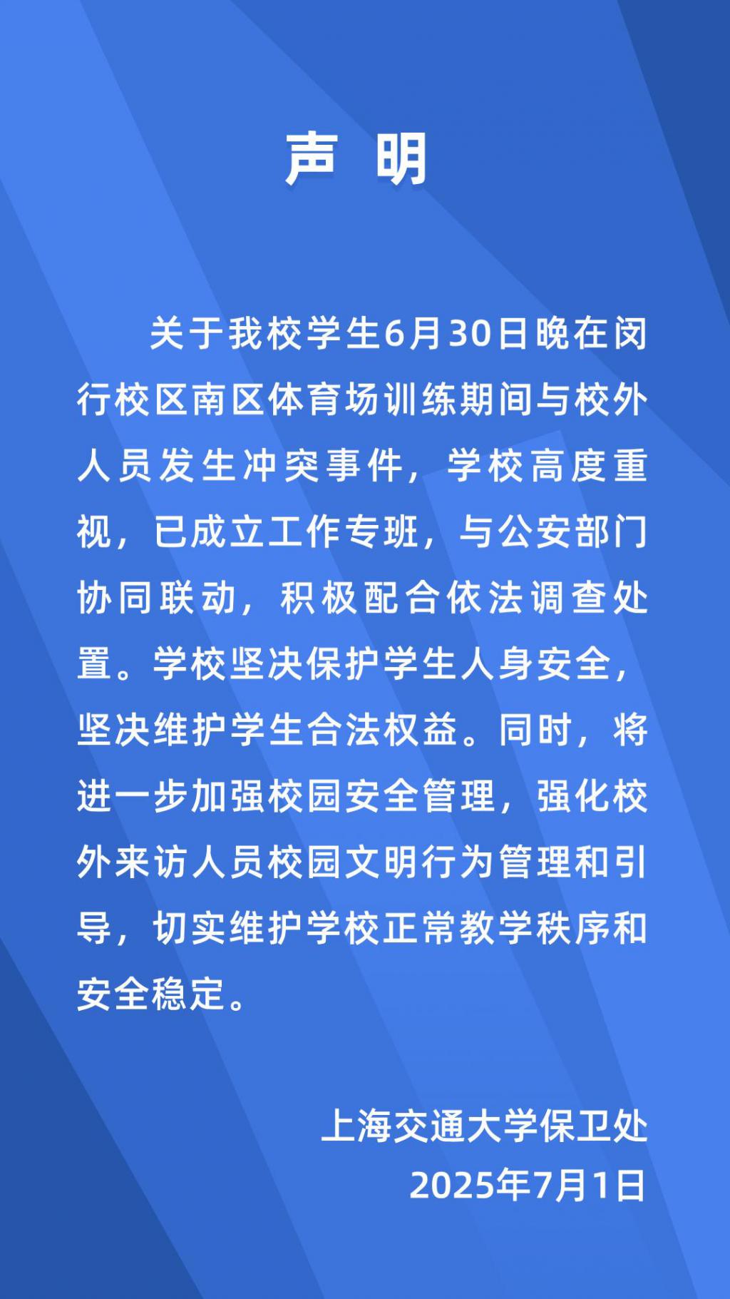 大学生在校内体育场训练时与校外人员发生冲突,上海交大最新通报综合