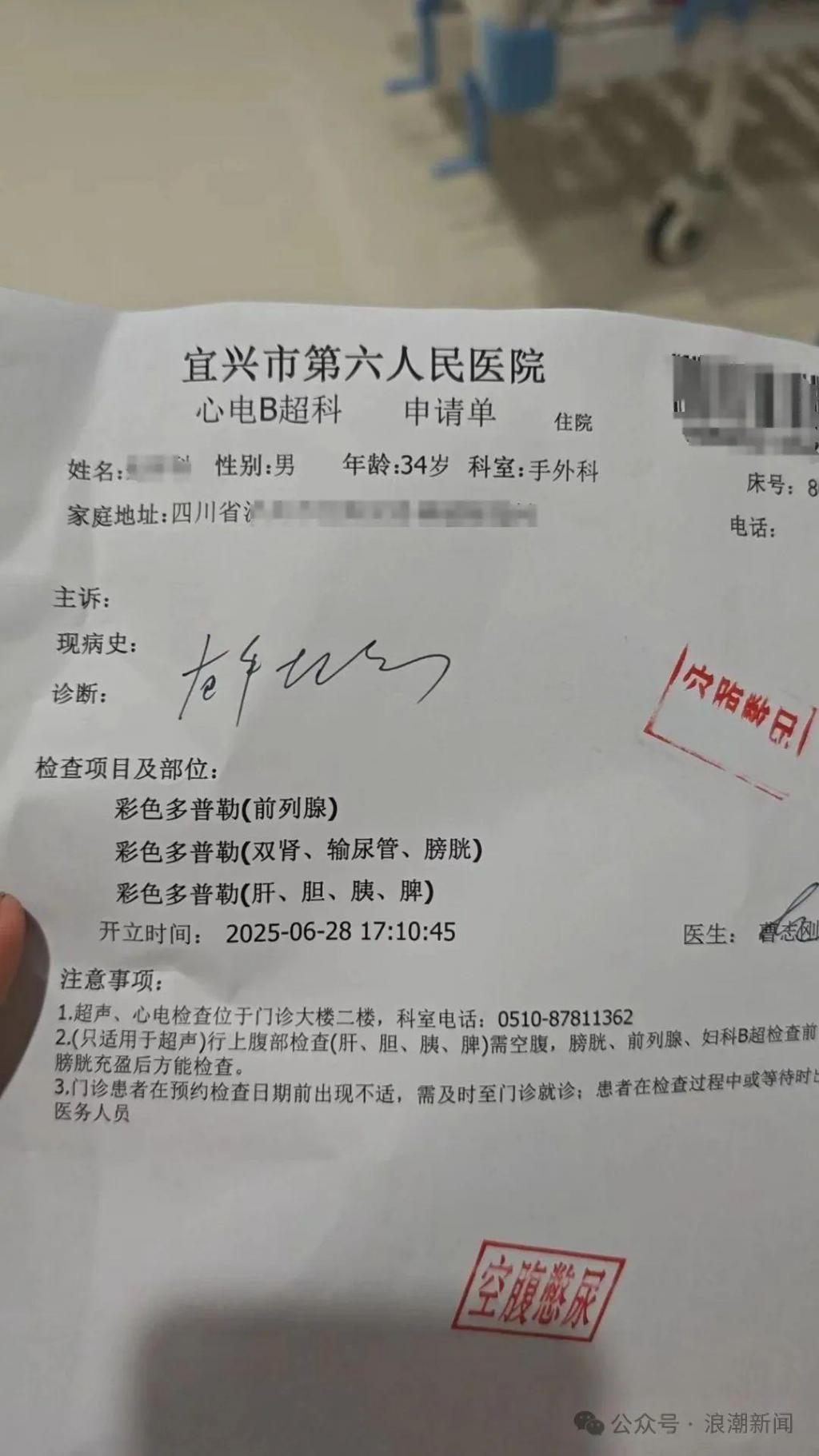 男子手部外伤住院,医院开出“奇怪”检查单,包括前列腺检查,院方、当地卫健委回应综合